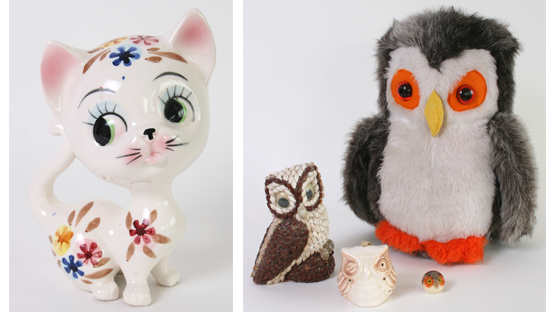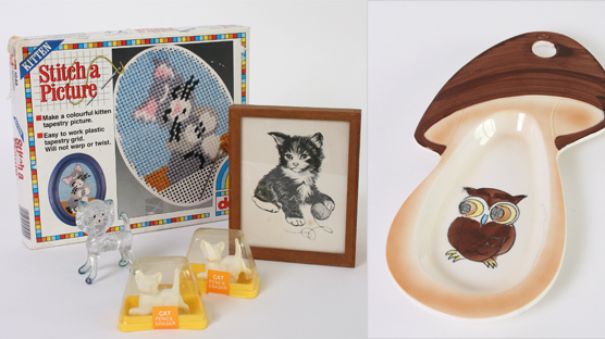I decided to create Thrift-ola Vintage Knick-Knack Packs which will be brought through to the online shoppe in a few months time ready for *said in a really quiet voice* Christmas. Sorry to say the C word. To launch the idea I’ve created a cat pack (pictured above) and an owl pack (pictured below) which are both in the ebay sale. Have you ever discovered spoon rests? Mostly made from ceramic they’re a pretty dish style piece that you can rest a spoon in inbetween stirs. The natty manufacturers must’ve realised this use would be limited though as most spoon rests also have little holes in the top so you can hang ’em on the wall as a pretty piece of home decor. Here we have a mushroom shaped version with an owl illustration. Two of my favourite things. Bid here.